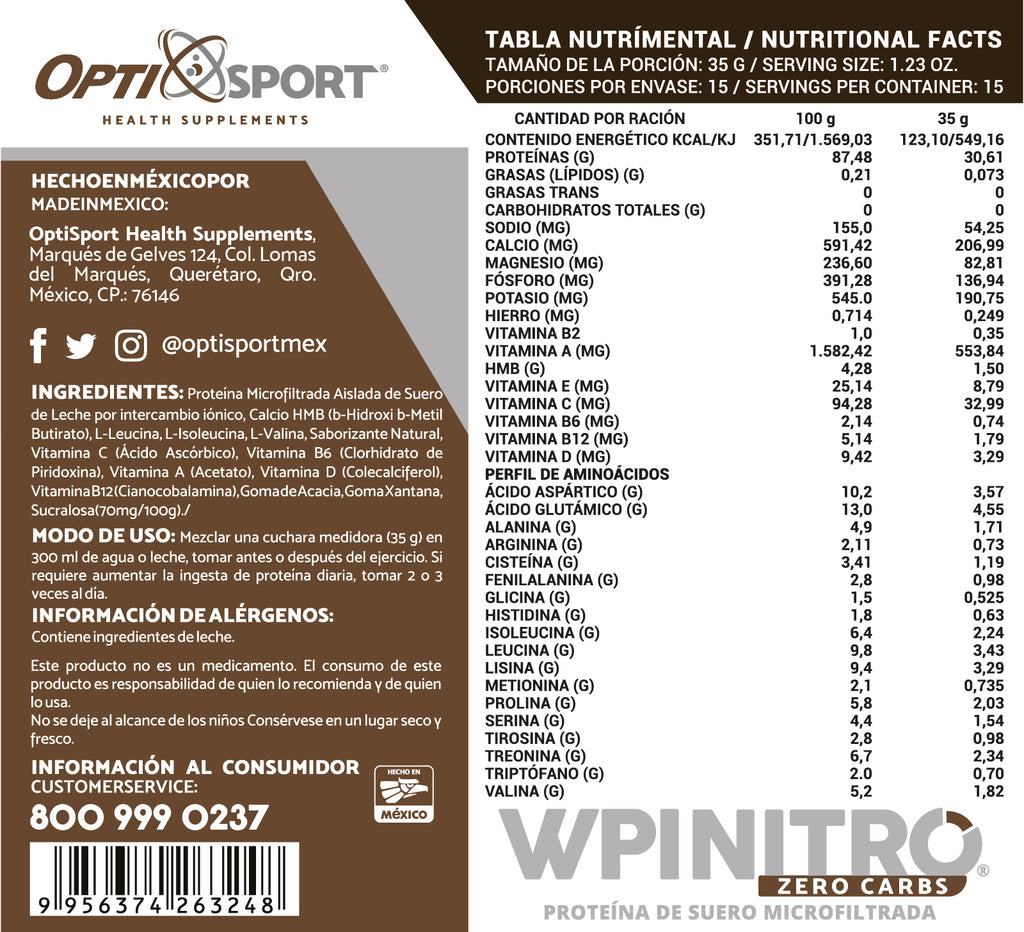 WPI NITRO® contiene Proteína de Suero de Leche Isolatada (microfiltrada) de alta calidad , sin grasa, sin lactosa, sin hidratos de carbono y sin colesterol.